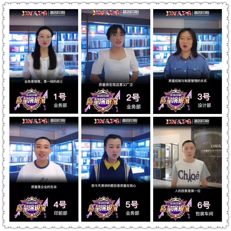 為了讓“質(zhì)量”意識深入人心,基因印刷組織了一場別開生面的“質(zhì)量演說家”演講比賽。負責人積極商討比賽形式,最后決定通過視頻錄制的形式公開發(fā)布在線上請客戶和全體員工投票。票選出的優(yōu)秀代表在本周六的質(zhì)量大會上進行現(xiàn)場的演講。新穎的比賽形式激發(fā)了全體員工的熱情,各部門員工踴躍參與,利用早會和空余時間進行練習和彩排,最后共有16人脫穎而出。不同部門的員工從不同的角度詮釋了自己對“質(zhì)量”的理解,一遍遍的練習,一遍遍的重復(fù),不僅演講人自己,聽的人也在不知不覺中對“質(zhì)量”有了自己的思考。